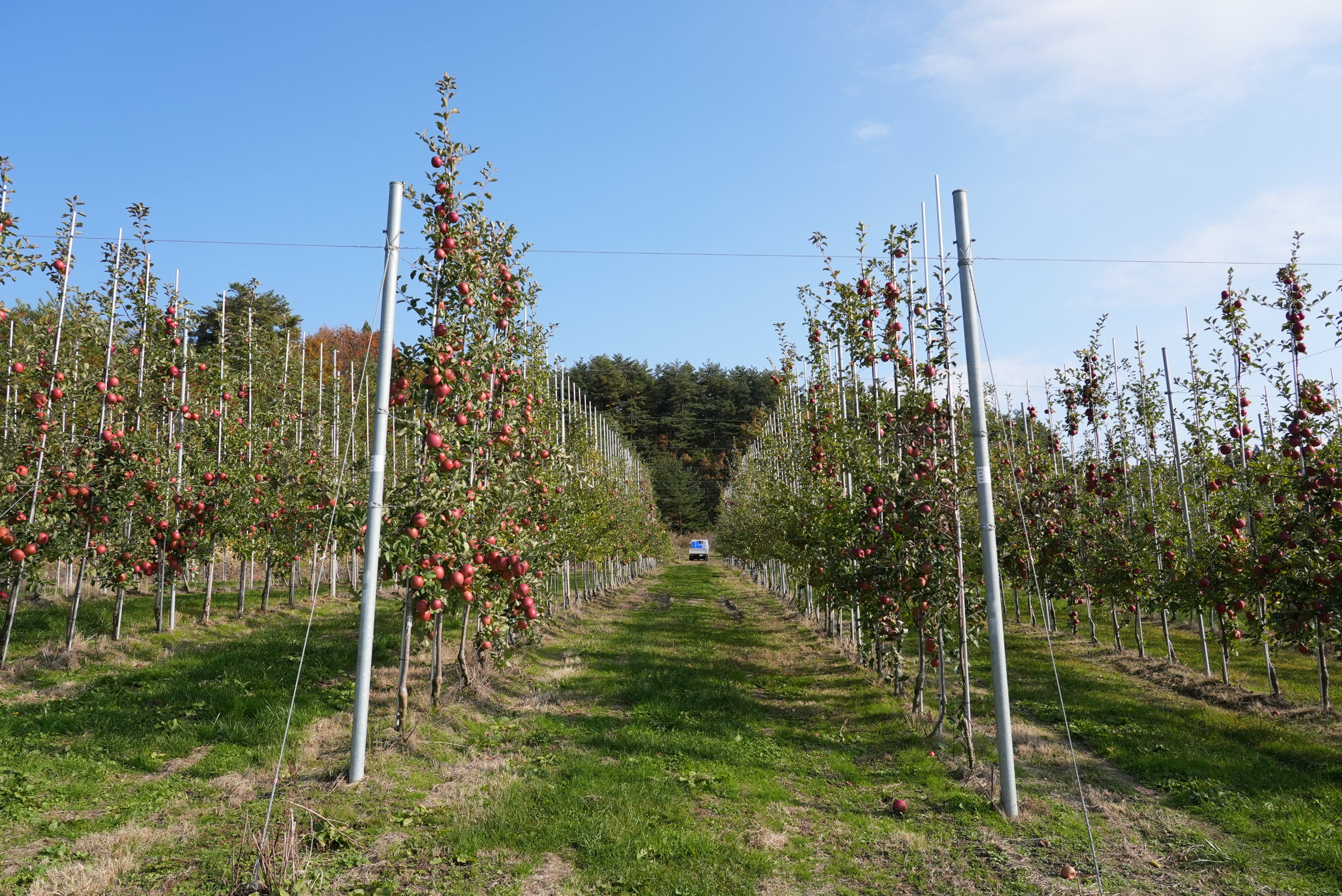 ベルファームのりんご園地では、日本農業が研究開発・導入する、より生産効率の高い海外式の栽培方法「高密植栽培」*1を採用します。