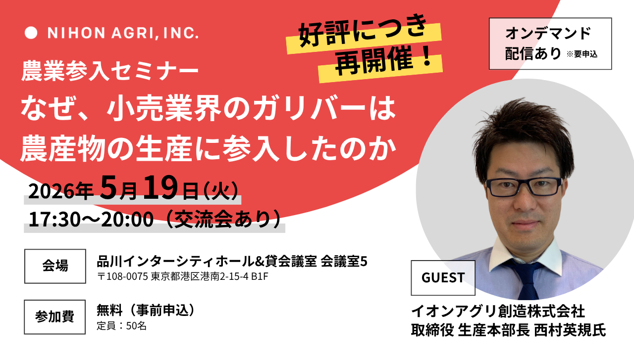 日本の農産物の生産から販売まで一気通貫で展開し、新たな産業構造を創出する株式会社日本農業(以下「日本農業」)は、2026年5月19日(火)17:30より農業参入を検討する企業の担当者向けにセミナーを開催します。第16回のゲストには、全国21カ所のイオン直営農場の運営および農産物の生産委託に取り組むイオンアグリ創造株式会社(以下「イオンアグリ創造」) 取締役 生産本部長 西村英規氏を迎え、「なぜ、小売業界のガリバーは農産物の生産に参入したのか」をテーマに、そのご経験や取り組みについて伺います。